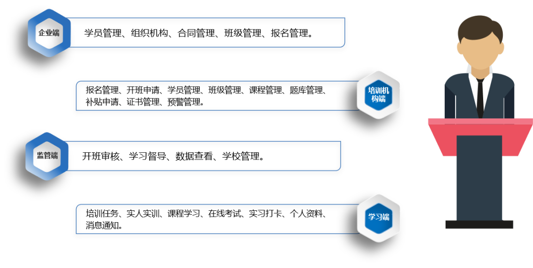 平臺采用“管、教、學(xué)”一體化的教學(xué)流程,結(jié)合海量實際安防項目,用案例支撐理論,為廣大安保企業(yè)輸送優(yōu)質(zhì)安防管理人才,幫助學(xué)校和學(xué)員實現(xiàn)更高效、更便捷的教學(xué)互動;貼合現(xiàn)代化生活模式,極致利用碎片化時間幫助學(xué)員完成學(xué)業(yè),突破時間和地理因素的限制。